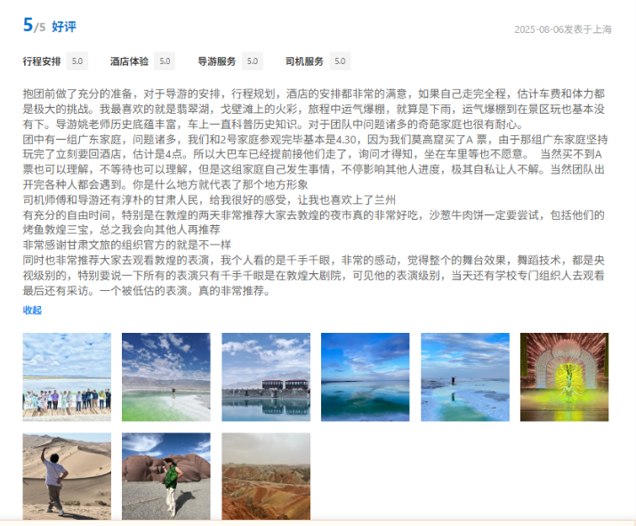 文旅国旅深度整合甘青两地的经典与小众旅游资源,精心打造、上线行程丰富、体验舒适产品的同时南京运营中心紧密围绕游客核心需求,协同配备金牌工作人员随团提供专业讲解与服务,获得广泛好评。平台数据显示,近半年以来,其携程店铺订单量同比增长超过40%,订单完成率高达98.5%,展现出高度的市场认可与出色的运营效能。用户口碑方面,店铺好评率持续稳步提升,目前已达4.9分,累计精选好评超千条,“质量可信、服务可依”的品牌形象日益凸显。