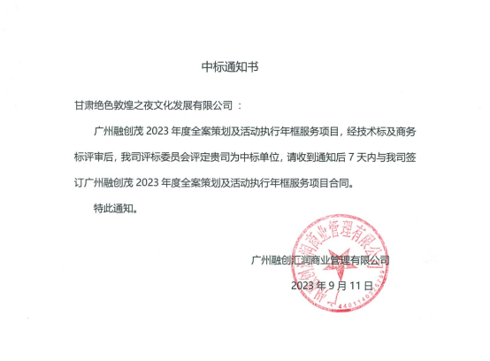 9月11日,在历经三轮的竞价谈判,经过层层筛选和激烈角逐,乐动平台app官网_乐动(中国)集团旗下乐动平台app官网_乐动(中国)运营集团子公司甘肃绝色敦煌之夜文化发展有限公司成功中标广州融创茂2023年度全案策划及活动执行年框服务项目。