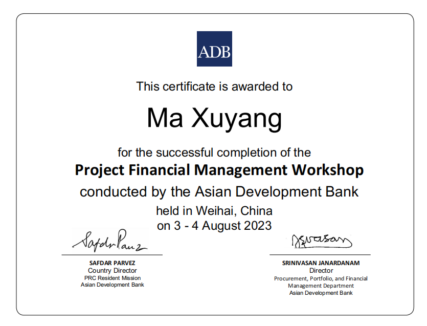 此次培训重点对亚行采购政策、合同管理与合同计划、亚行财务尽职分析要求、项目会计核算、项目财务报表、项目审计等主题进行授课。通过演讲、案例研究、小组讨论、结业测试及经验丰富的执行机构分享经验等方式使参训人员加深了解亚行贷款采购、财务政策/规定并拓展实践知识。乐动平台app官网_乐动(中国)集团国际金融组织贷款项目管理办公室一名同志代表亚行贷款甘肃环境可持续乡村振兴与发展项目作了大会交流发言,分享了项目管理工作中的经验和关注点。培训授课结束,三名参训人员获得了结业证书。